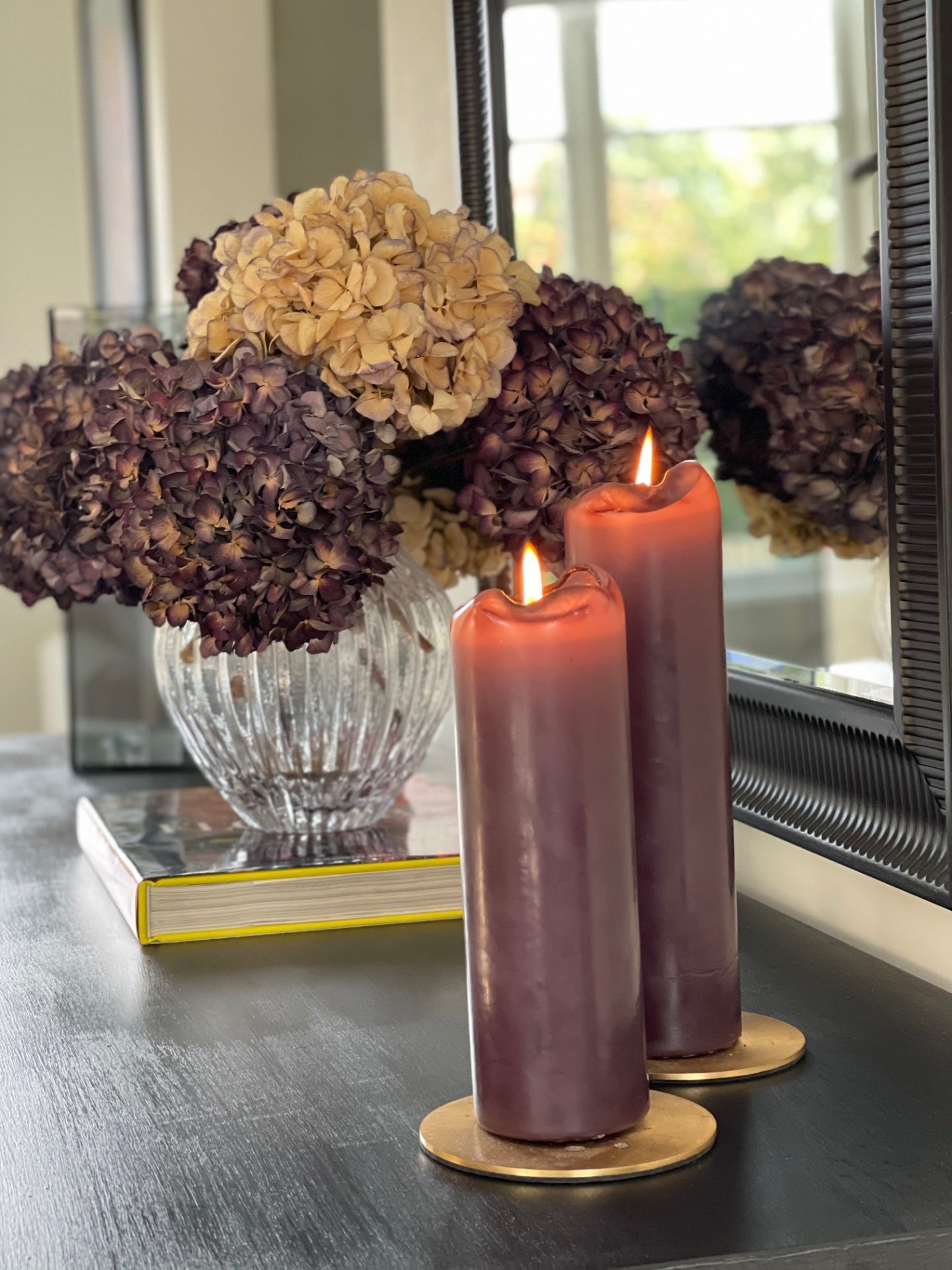 På min byrå i hallen står en stor vas med torkade hortensior från min trädgård, även dom går i olika lila toner (gissa min favoritfärg?). Bredvid stå höga blockljus på mässingsfat, även dom från Ester & Erik.