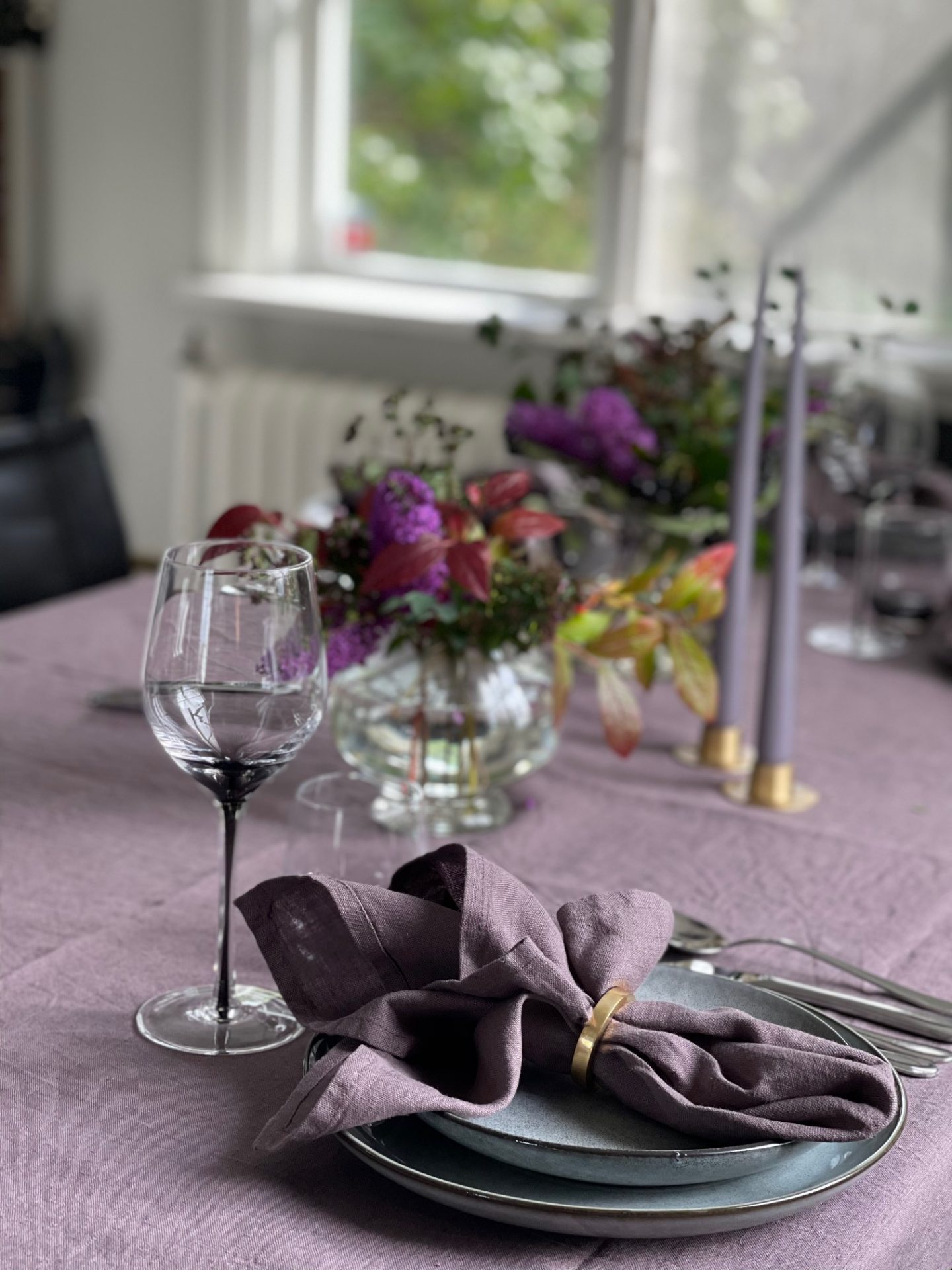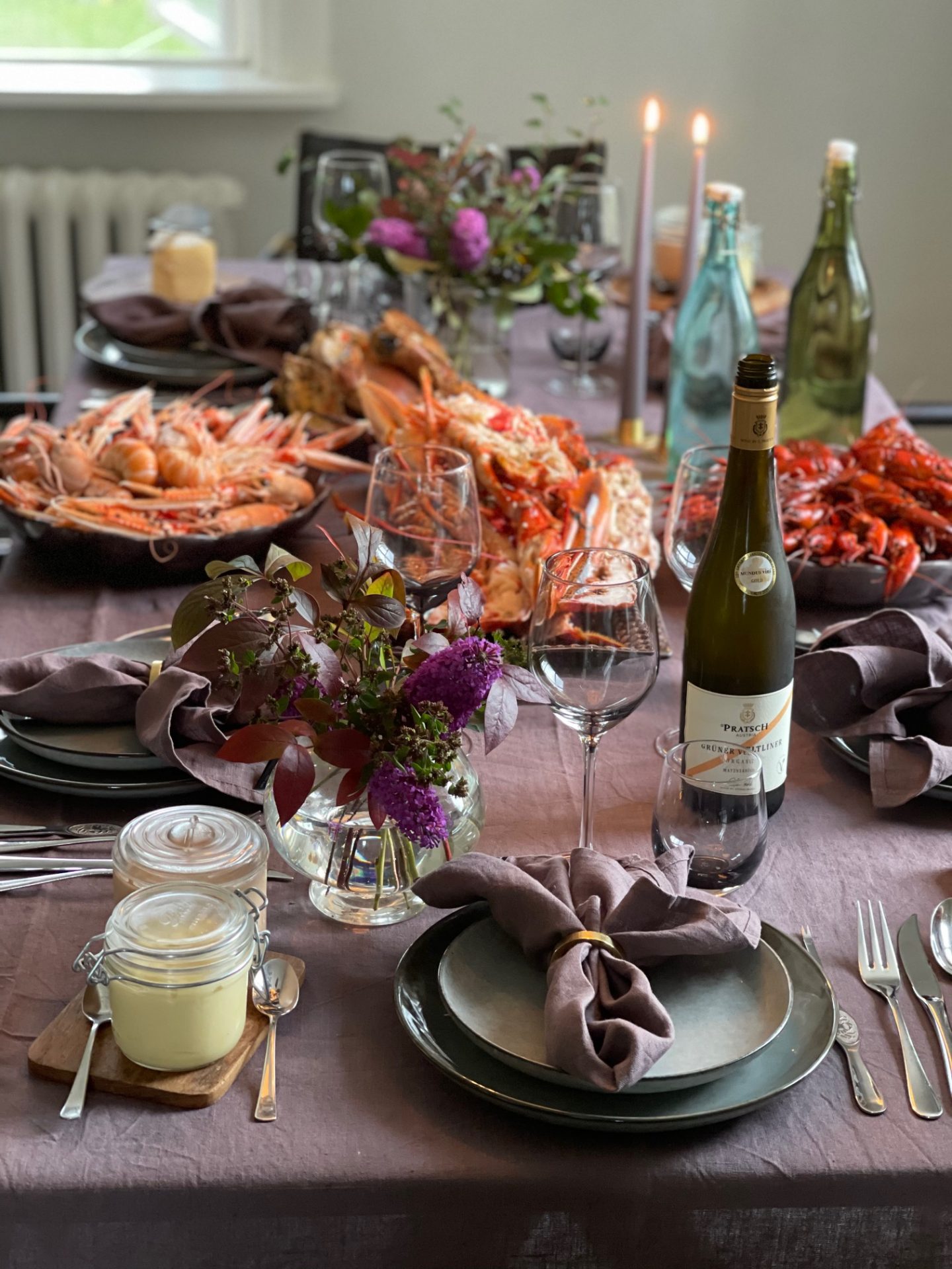 Kvällen i ära hade jag lila linneduk och servetter och ljus i samma ton. Ljusen och ljusstakarna i mässing kommer från danska Ester & Erik. Jag gillar att ljusstakarna är låga så att ljusen inte hamnar för högt upp. Det är snyggt när lågan från ljusen speglar sig i vinglas och flaskor på bordet och är lågan för högt upp så uteblir den effekten.