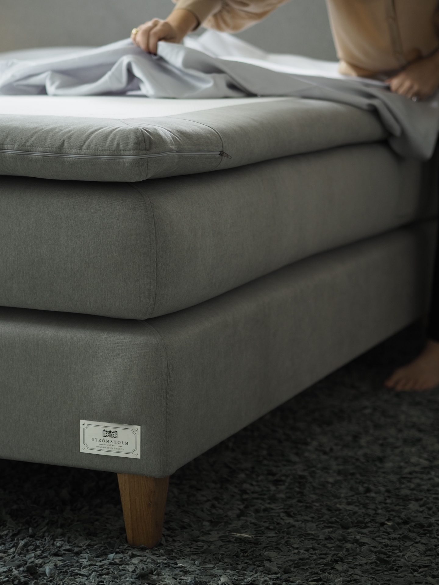Det blev en 160 bred kontinentalsäng från Strömsholm Beds. Rummet i källaren är ganska litet så 160-säng blev perfekt. Den stora och rejält vadderade gaveln med nitar bidrar en hel del till hotellkänslan men bäddningen är minst lika viktig.