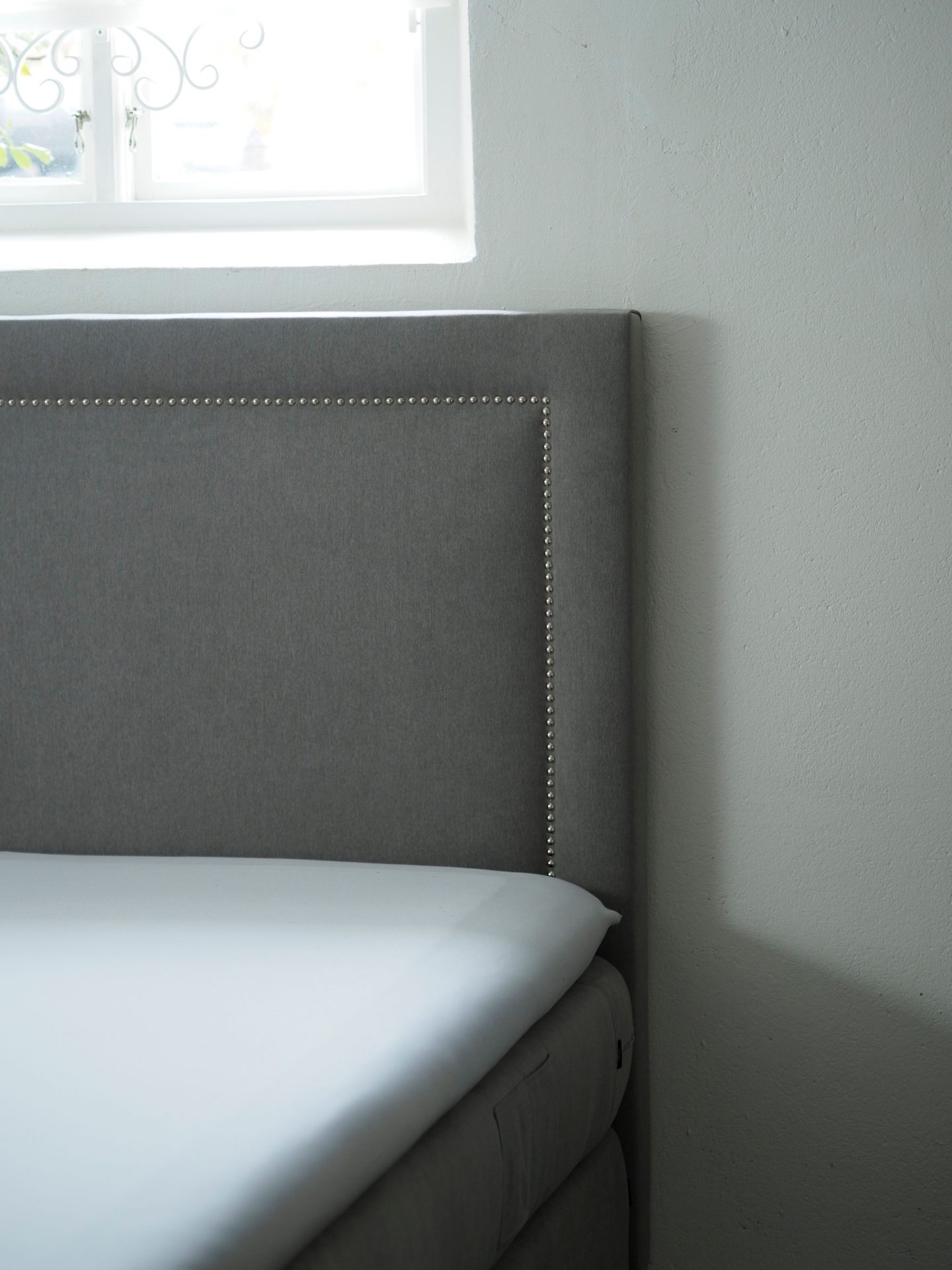 Jag valde en ljusare grå nyans än sängens färg på sängkläderna och det blev faktiskt riktigt snyggt. Vita lakan kan bli för sterilt och vill man få till en mysigare känsla så är det bra en en ljus färg som gärna får gå i samma ton som sängen i övrigt. Den tjockt vadderade gaveln med nitar heter MATHILDA och både den och sängens färg heter ”STONE”.