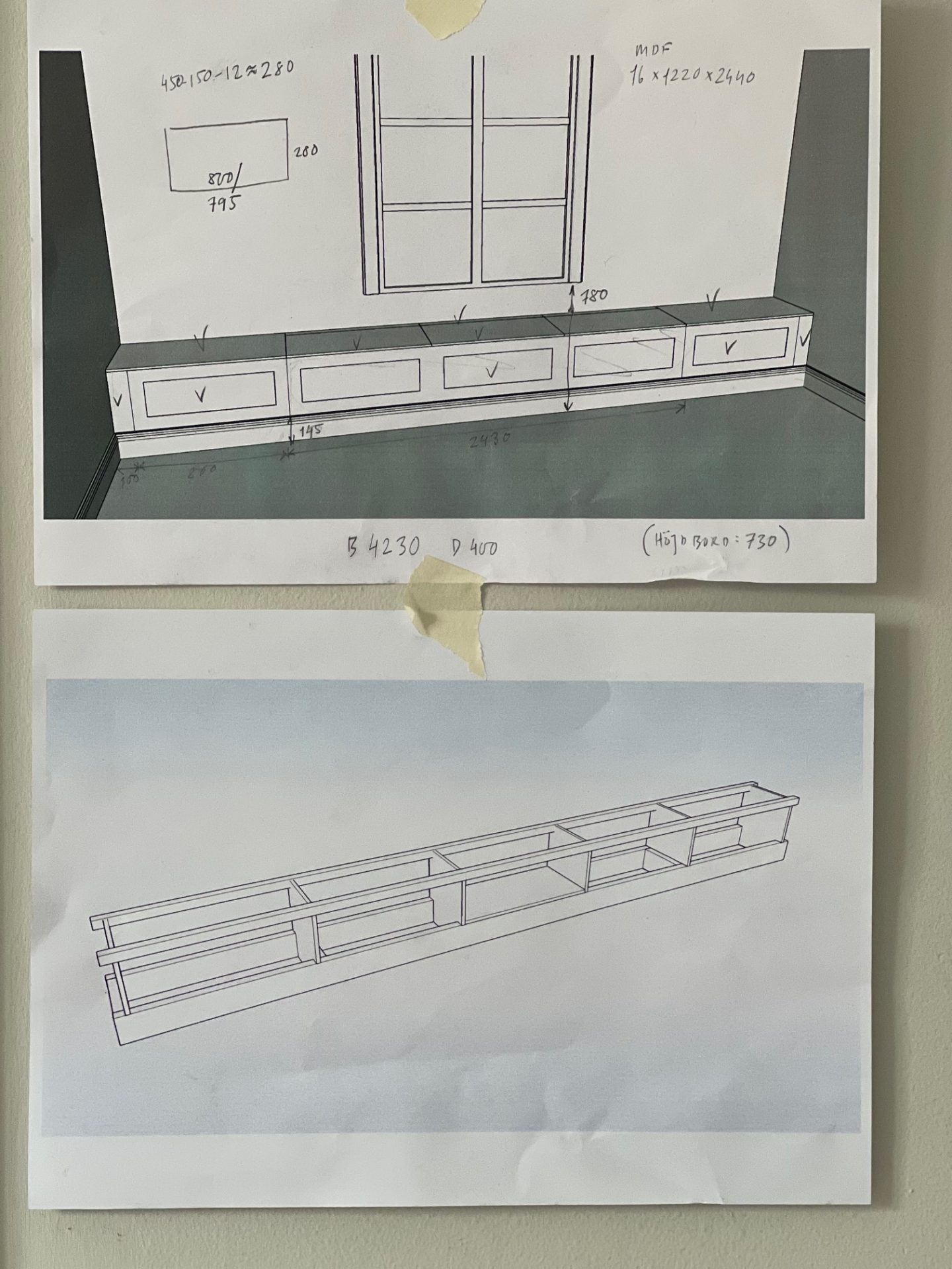 Här är ritningen på sittbänken och tanken är att den ska målas in i samma färg som väggen. Eftersom det blir stolar på andra sidan bordet så vill jag inte att sittbänken ska sticka ut så mycket så det inte blir 900 miljoner olika material och möbler att ta in utan en mer enhetlig känsla.