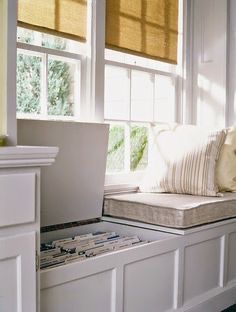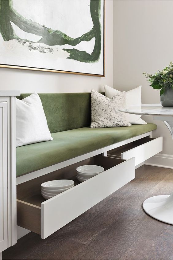Jag hittade bilder på sittbänkar som var långt ifrån ”kökiga” och lantliga. På bilden ovan har man byggt bänken med dold förvaring för tallrikar vilket är toppen för ett hem med öppen planlösning= noll väggar att ha skåp/förvaring på.